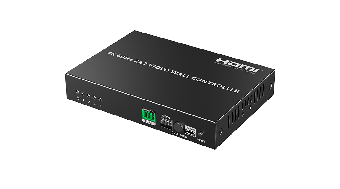 This product is a 1-in-4-out video wall controller, supports one HDMI™I source input and four HDMI™ outputs. Supports 1x1/1x2/1x3/1x4/2x2 splicing modes, which can be set by RS-232 or dip switch. The product can flexibly adapt to different installation requirements, which can be widely used in security monitoring, rail transit, broadcasting, smart cities, home theatre, training and other fields.